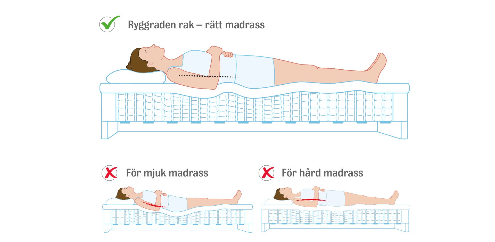Men har du t ex en för mjuk säng eller hård säng så kommer din ryggrad inte vara rak, givetvis får man ont i ryggen förr eller senare då. Tänk själv om du skulle stå lika fel med ryggen under dagen i flera timmar som du ligger fel på natten?